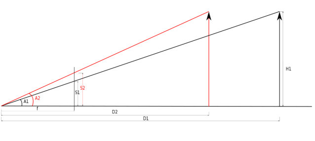 1. tan(A2) = S2/f || 2. tan(A2) = H1/D2 || 3. S2*D2 = f*H1 4. tan(A1) = S1/f || 5. tan(A1) = H1/D1 || 6. S1*D1 = f*H1