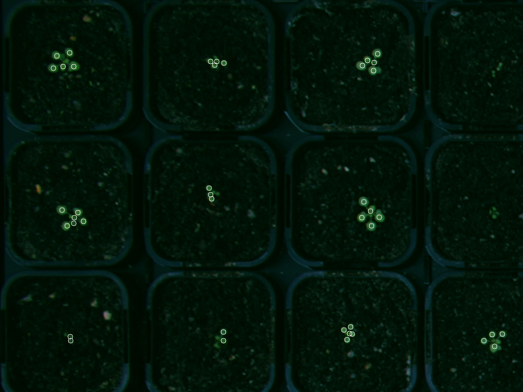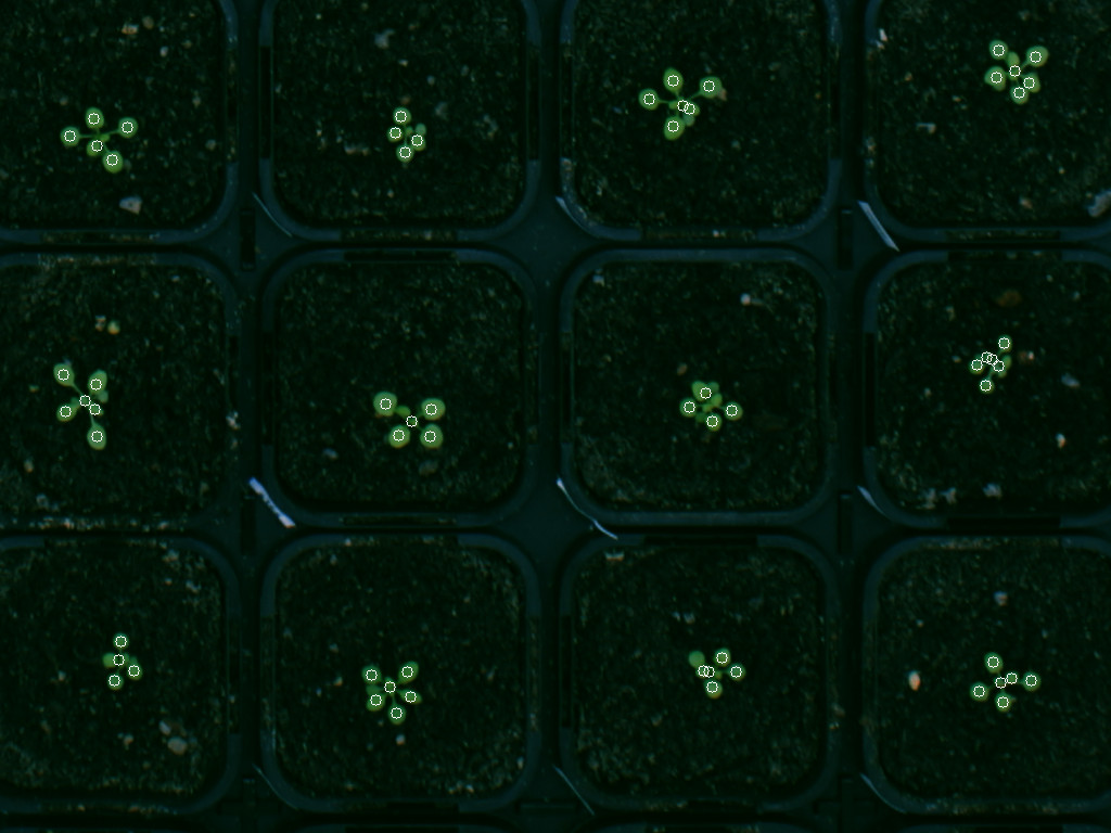 The circles mark the detected leaf centers. Some of the leafs of these plants are not detected because they don’t translate into a detectable maximum in the distance transformation.